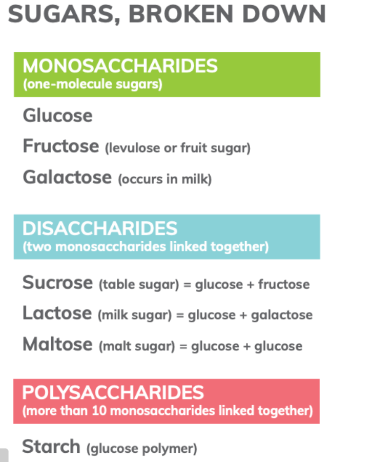 If you go back to chemistry class, you learn that sugar is made up of the molecules: glucose, fructose, and galactose (occurs in milk). These molecules can combine to make more complex carbohydrates.